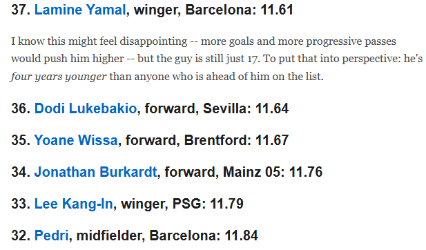매체는 득점 수와 공을 가지고 전진한 거리, 예상 어시스트 기대값을 모두 더해 순위를 매겼고, 이강인은 총점 11.79점을 받아 33위에 오르며 벨링엄(46위), 라민 야말(37위)을 제쳤다. 세계 최고 명문 레알 마드리드와 바르셀로나에서 에이스 역할을 맡고 있는 두 선수보다 이강인의 공격적 관여도가 더 뛰어났다는 평가였다.