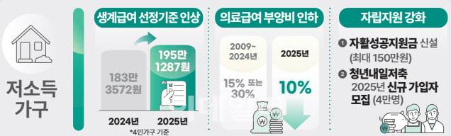 10일 보건복지부는 2025년 업무보고를 통해 생계급여 등 74개 복지사업 선정기준이 되는 기준중위소득을 6.42% 인상한다. 생계급여는 1인 가구의 경우 월 71만 3000원에서 76만 5000원으로 월 5만 2000원이 인상된다. 4인 가구는 월 183만 3000원에서 195만 1000원으로 11만 8000원 인상된다. 의료급여 수급자의 소득 산정 시 포함되는 부양비 부과비율은 16년 만에 30% 또는 15%에서 10%로 인하한다.