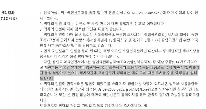 국민신문고가 뉴진스 하니의 불법체류 신고에 대해 "조치를 취할 예정"이라고 답변했다.