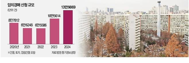 10일 법원 등기정보광장에 따르면 지난해 임의경매 신청한 부동산(건물·토지·집합건물)은 13만9869건으로 집계됐다. 2013년(14만8701건) 후 최대 규모다. 2023년 전체 임의경매 신청 건수(10만5614건)를 크게 웃돌고, 2022년(6만5586건)과 비교하면 두 배 수준에 이른다.