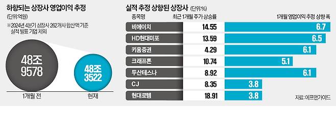 10일 에프앤가이드에 따르면 증권사 추산치가 존재하는 상장사 262곳(실적 발표 기업 제외)의 작년 4분기 영업이익 추정치 합산액은 48조3522억원이다. 1개월 전 48조9578억원에서 1.28% 감소했다. 최근 한 달 새 증권사가 영업이익 추산치를 5% 이상 올려잡은 종목은 11개에 불과하지만 5% 이상 내려잡은 종목은 43개였다.