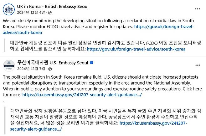 주한 미국대사관도 지난 12월 7일 홈페이지와 SNS에 올린 '보안 경고: 한국 내 현재 정치 상황에 대한 미국 시민을 위한 지침'을 통해 "시위가 진행되는 지역은 피하고, 대규모 군중, 모임, 시위 또는 집회 근처에서는 주의를 기울여야 한다"면서 "평화적인 시위를 의도한 것조차 대립으로 변하고 폭력으로 확대될 수 있다"고 경고했다.
