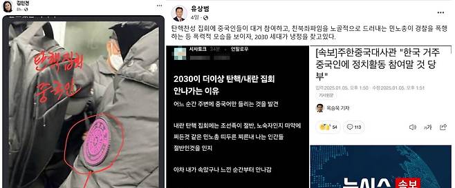 | ▲ 김민전 국민의힘 의원은 지난 5일 자신의 페이스북에 “탄핵(찬성) 집회에 참석한 중국인”라는 내용이 담긴 한 강성 지지자의 글과 사진을 공유했다 삭제했다(왼쪽). 같은 당 유상범 의원도 이날 자신의 소셜미디어에 “탄핵 찬성 집회에 중국인들이 대거 참여하고 있다"고 주장했다. |