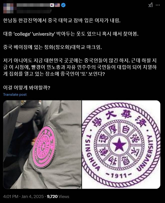 | ▲ ‘공산당헌터’라고 밝힌 한 누리꾼이 지난 4일 오후 4시쯤 X(옛 트위터)에 사진을 올리면서 “한남동 한강진역에서 중국 대학교 잠바 입은 여자가 내림”이라고 주장했지만, 해당 사진만으로는 정확한 촬영 장소와 시간은 물론, 해당 옷을 입은 인물의 성별이나 국적, 집회 참석 여부도 확인할 수 없다. |