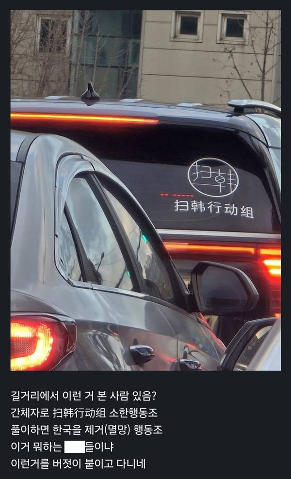| ▲ 해당 사진은 '소한행동조'라는 스티커를 붙인 차량의 사진이었다. 디시인사이드, 에펨코리아, 루리웹 등 온라인 커뮤니티 다수에서 해당 사진과 함께 "길거리에서 이런 거 본 사람이 있냐? 풀이하면 한국을 제거(멸망)하기 위해 행동조"라는 설명이 나돌았다. |