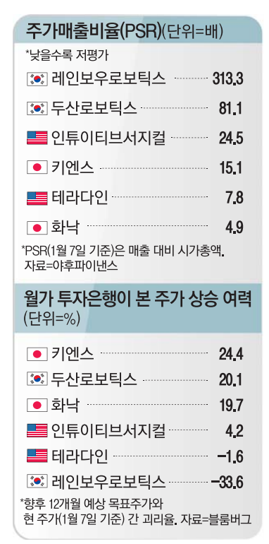 PSR이 300배를 넘는 ‘초고가’ 영역에 도달했다는 것도 투자 위험 요인이다. 증권가 관계자는 “삼성전자가 레인보우로보틱스 지분을 현 35%에서 60%까지 늘릴 것이란 호재와 내수 중심의 고평가주라는 악재가 공존하고 있다”고 평가했다.
