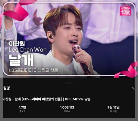 (엑스포츠뉴스 이정범 기자) '이찬원의 선물' 이찬원의 '날개'가 100만 뷰를 넘어섰다.