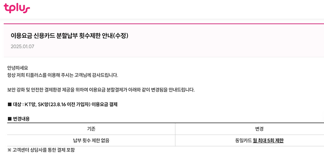 그런데 이용자들 입장에서 날벼락이 떨어졌습니다. 한국케이블텔레콤이 운영하는 알뜰폰 업체 '티플러스'는 지난 7일 신용카드 분할 납부를 제한한다고 밝혔습니다. 티플러스는 다음 달 1일부터 이용 요금을 신용카드로 나눠 납부할 경우, 그 횟수를 카드당 '월 최대 5회'로 묶기로 했습니다.