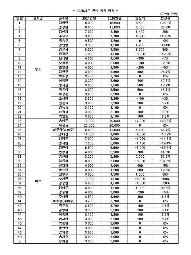 한편 지난해 선발투수로 활약하며 개인 한 시즌 최다승인 9승(8패)을 기록한 하영민은 106.3% 오른 1억6500만원에 도장을 찍었다. 불펜에서 중요한 역할을 맡은 주승우는 팀 내 최고 인상률인 140.6% 오른 7700만원에 서명했다.