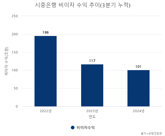 은행들의 비이자수익은 최근 줄어들고 있다. 은행연합회에 따르면 지난해 3분기까지 시중은행들의 누적 비이자수익은 100조5948억원 규모였다. 1년 전 같은 기간(116조5177억원)보다 13.7%가량 줄었다. 2022년(195조8320억원)과 비교하면 2년 새 48.6% 감소했다.