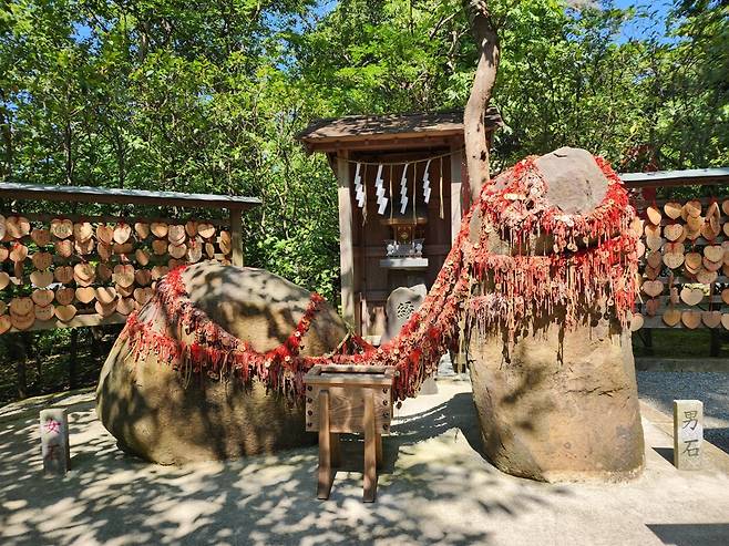 | ▲ 엔무스비 바위 남성 바위와 여성 바위가 실로 이어져 있고, 사람들은 이곳에서 좋은 인연이 이어지기를 기도한다. |