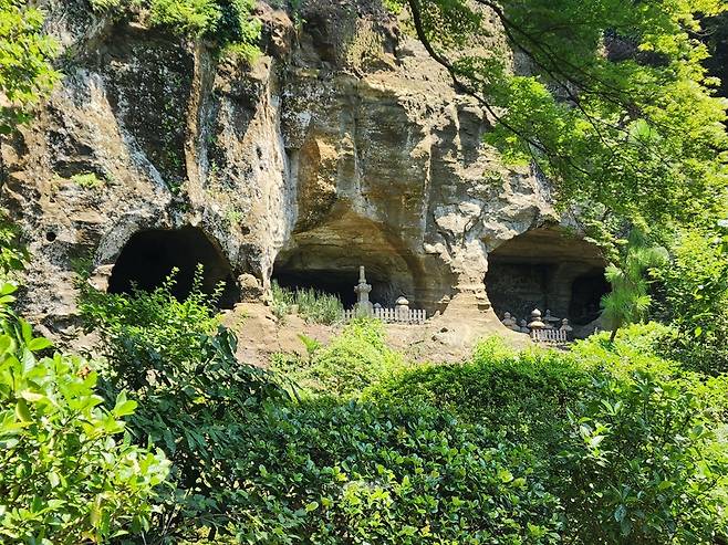 | ▲ 호코쿠지(報?寺) 에 있는 무사가문의 석굴묘 가마쿠라는 산이 많고 평지가 적어 야구라(やぐら)라는 독특한 매장 풍습이 생겨났다. |