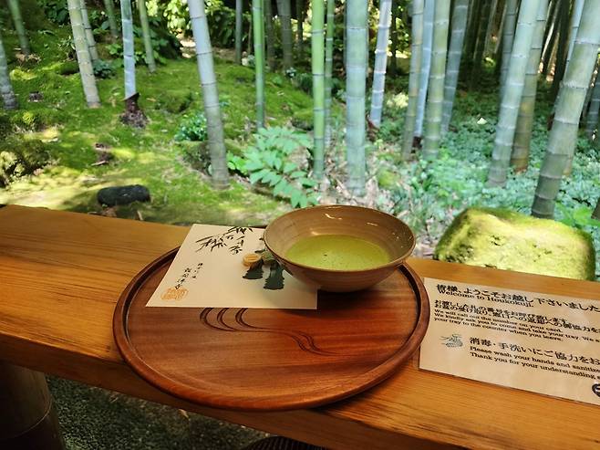 | ▲ 대나무 숲에서 말차를 마시는 체험 호코쿠지에서는 대나무숲에서 말차를 마시는 체험을 할 수 있다. (입장료 400엔, 다도체험포함 1,000엔) |