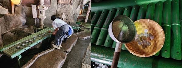 | ▲ 돈이 불어나는 샘물에서 돈을 씻는 방법 바구니에 동전을 담고 준비된 바가지로 흐르는 샘물을 떠서 세 번 붓는다. |