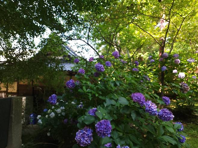 | ▲ 수국이 피어 있는 쿠즈하라오카 신사(葛原岡神社) 쿠즈하라오카 신사(葛原岡神社)는 인연을 이어주는 것으로 유명하다 |