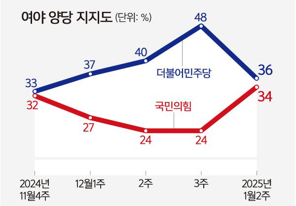 계엄·탄핵 사태를 겪으며 2배(12월 셋째주 민주당 48%-국민의힘 24%)로 벌어졌던 지지율이 예전 수준으로 돌아간 셈이다.