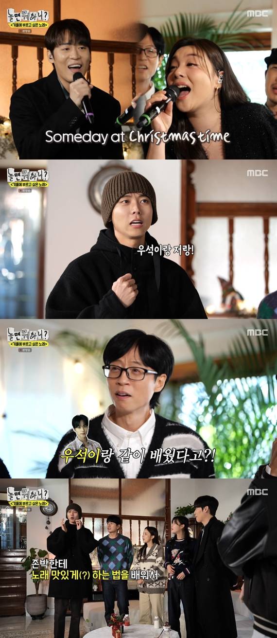 따뜻한 분위기의 실내에 입성한 '놀뭐' 멤버들은 윈터송을 함께 부를 게스트들이 누구일지 궁금해했다.