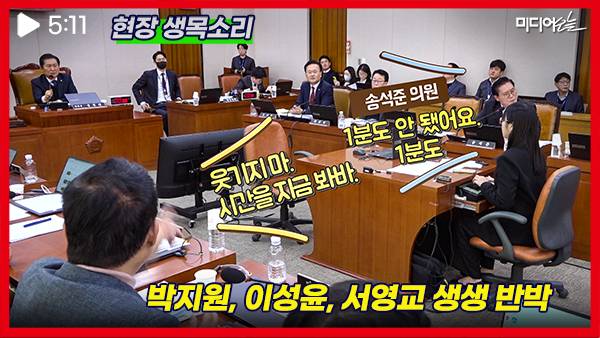 영상엔 마이크가 꺼진 채 내란수괴 표현에 반박하며 윤 대통령 체포 시 예의를 당부하는 송석준 의원에게, 박지원 의원을 비롯한 민주당 의원들이 끼어들며 반박 야유하는 생생한 법사위 현장이 담겼다.
