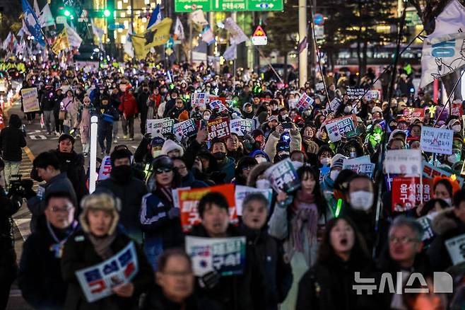 [서울=뉴시스] 정병혁 기자 = 11일 서울 종로구 사직로에서 열린 윤석열 대통령 탄핵 찬성 6차 범시민총궐기대회를 마친 참가자들이 명동 방향으로 행진하고 있다. 2025.01.11. jhope@newsis.com