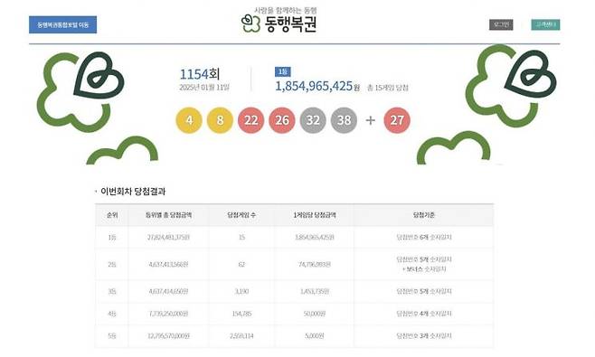 로또복권 운영사 동행복권은 제1154회 로또복권 추첨에서 '4, 8, 22, 26, 32, 38'이 1등 당첨 번호로 뽑혔다고 11일 밝혔다. 2등 보너스 번호는 '27'이다.