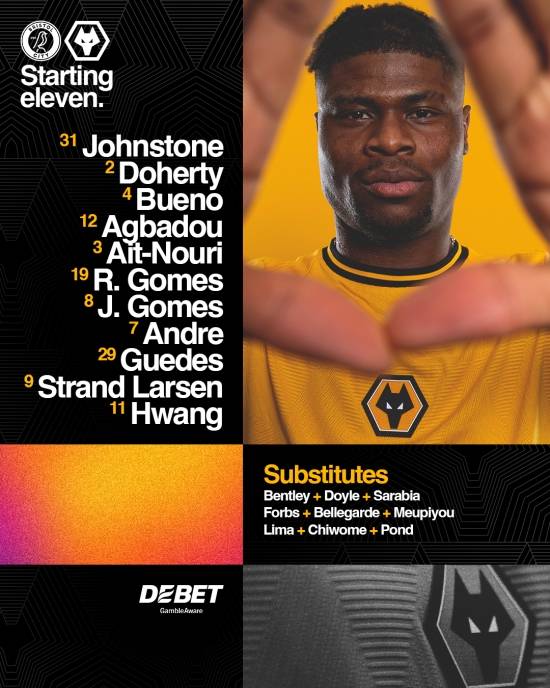 울버햄튼은 이날 3-4-3 전형으로 나섰다. 샘 존스톤 골키퍼가 장갑을 꼈고 맷 도허티, 사티아고 부에노, 그리고 겨울 이적시장에 영입된 에마뉘엘 아그바두가 백3를 구축했다. 중원은 안드레와 주앙 고메스가 지켰고 라얀 아이트누리, 호드리구 고메스가 윙백을 맡았다. 측면 공격에 곤살루 게데스, 황희찬, 최전방에 외르겐 스트란드 라르센이 출격했다.