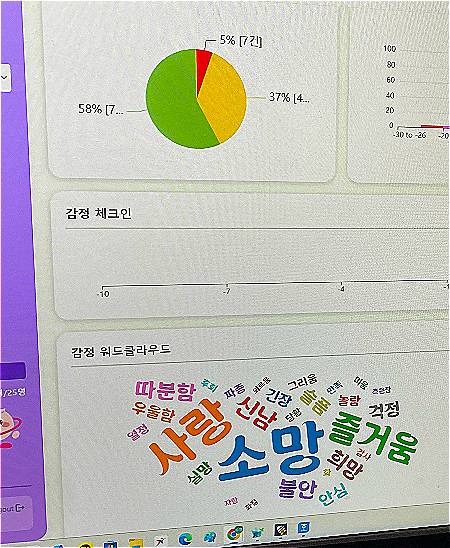 주말에 있었던 일을 문장으로 쓰는 거였다. 어떤 아이는 고양이를 키우게 됐다며 설레는 마음을, 또 다른 친구는 동생이 장난쳐서 화가 났던 이야기를 또박또박 써 내려갔다. 남자 선생님은 그걸 교실 앞 모니터 화면에서 봤다. 학생들이 쓴 글을 '심스'란 프로그램이 자동으로 분석해 감정 상태를 보여주었다. 이를 토대로 상담할 수 있다고 했다.