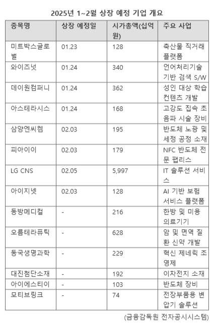 2월 상장을 앞둔 기업들의 면면을 보면 LG CNS 외에도 면역질환 신약 개발사 오름테라퓨틱, 한방 및 미용 의료기기 전문기업 동방메디컬, 조영재 전문기업 동국생명과학 등 주요 제약·바이오 기업들이 포진돼 있다. 최근 반등이 예고된 반도체와 이차전지 분야에서도 아이에스티이, 대진첨단소재 등이 출사표를 던졌다.