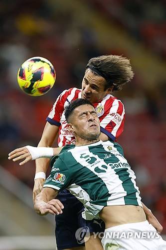 epa11819454 Teun Wilke of Guadalajara (L) in action with Santiago Nunez of Santos during a Liga MX Clausura tournament match in Guadalajara, Mexico, 11 January 2025. EPA/Francisco Guasco