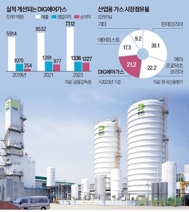 2023년 IMM프라이빗에쿼티(PE)는 국내 4위 산업용 가스 제조업체 에어퍼스트 지분 30%를 블랙록에 매각할 때 EBITDA 멀티플 25배를 인정받았다. 지난해 매각 작업을 진행한 에어프로덕츠코리아의 몸값도 EBITDA 멀티플 20배 수준으로 논의됐다. DIG에어가스의 몸값이 4조~5조원대로 예상되는 배경이다.