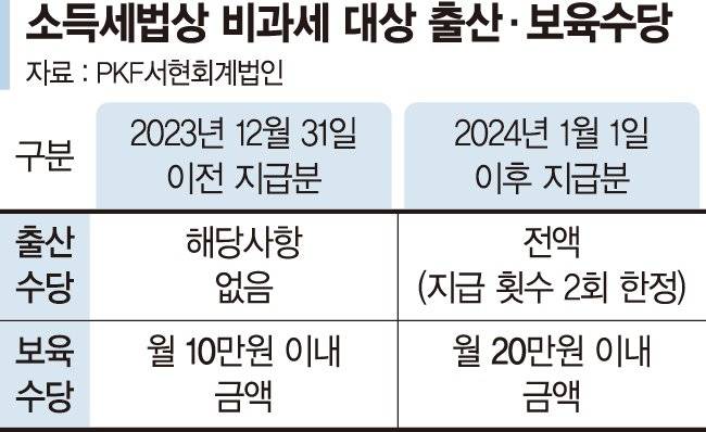 12일 PKF서현회계법인에 따르면 소득세법상 근로자 본인 또는 배우자의 출산, 6세 이하 자녀 보육과 관련해 지급받는 급여는 월 10만원 한도로 비과세돼왔다. 하지만 2023년 12월말 개정된 소득세법에 따라 2024년부터 받는 보육수당 공제 한도는 월 20만원까지 상향됐다. 연간 최대 240만원까지 비과세가 적용된다는 뜻이다.