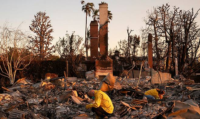 | 잿더미로 변한 주택가 미국 캘리포니아주 남부에서 발생한 대형 산불이 서부 최대 도시 로스앤젤레스(LA)와 인근 지역을 초토화하고 있는 가운데 11일(현지시간) LA 인근 고급 주택지구인 퍼시픽 팰리세이즈에서 주민들이 화재로 소실된 집의 잔해를 살펴보고 있다. LA=로이터연합뉴스 |