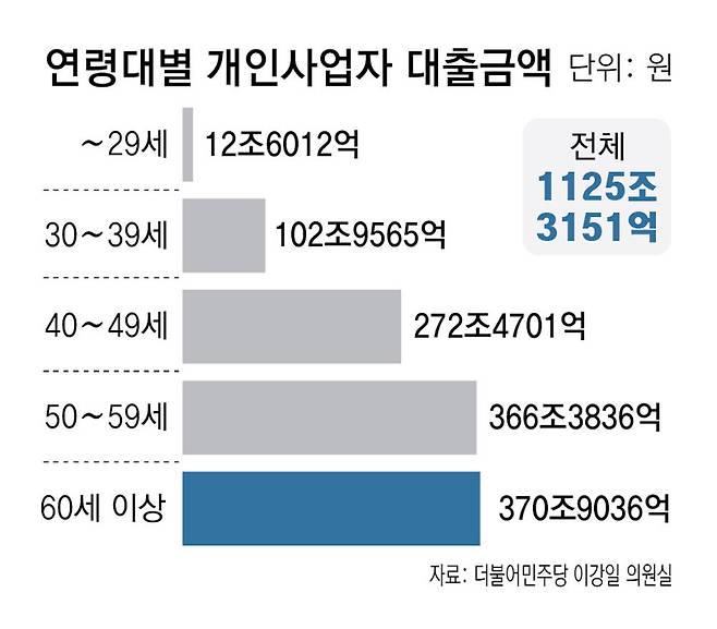 특히 50, 60대 자영업자의 대출잔액이 전 연령대 대출잔액 총합의 절반을 초과했다. 50대 자영업자의 대출잔액은 366조3836억 원(32.6%), 60대 이상 자영업자의 경우 370조9036억 원(33.0%)이었다. 두 연령대를 합치면 전체 대출금액의 65%에 해당하는 금액이다. 은퇴 후 소득 절벽에 대비해야 하는 이들의 빚 규모가 전체의 절반 이상을 차지하고 있는 것이다.