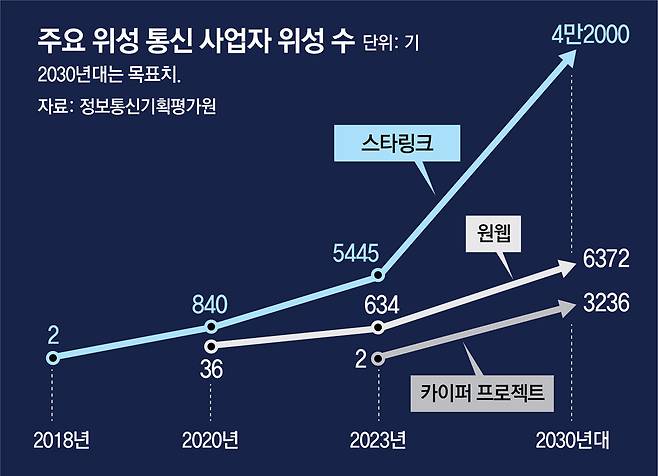 스타링크는 6000여 기의 위성을 운용하고 있으며, 2030년대까지 총 4만2000기의 위성을 쏘아올릴 계획이다. 아마존의 위성 통신 사업인 ‘카이퍼 프로젝트’는 지난해 시험 위성 2기 발사를 시작으로 2030년대까지 3236기를 올리는 것이 목표다. 국내에서는 지난해 과기정통부가 2030년대 초까지 6G 표준 기반의 저궤도 통신위성 2기를 발사한다고 밝힌 바 있다.