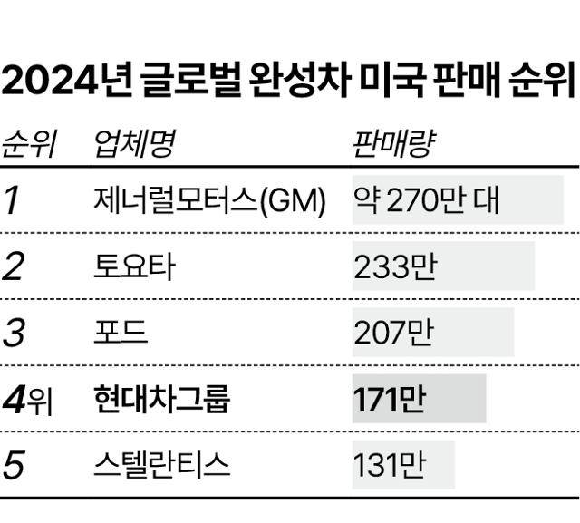 북미 시장 확대에 사활을 걸고 있는 현대차 그룹 입장에서 트럼프 2기의 관세 폭탄 가능성은 '넘어야 할 산'이다. 현대차·기아는 2024년 미국 시장에서 170만 대 이상을 판매하며 GM과 도요타, 포드에 이어 미국 판매량 '톱4'에 이름을 올렸다.