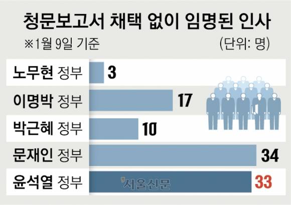 윤석열 정부 출범 이후 12일까지 인사청문회를 치러야 하는 고위공직자 가운데 청문보고서가 채택되지 않았음에도 임명이 강행된 후보자는 총 29명으로 파악됐다. 여기에 인사청문회를 실시하지 않고 임명된 4명의 후보자까지 더하면 총 33명이 일방적으로 임명됐다.
