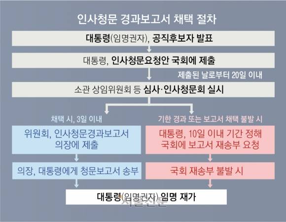 차재권 부경대 정치외교학과 교수는 “(인사청문보고서가 채택이 안 되면) 최소한 어느 정도 기간은 대통령이 임명을 못 하도록 하거나 제도화된 유예기간을 마련하는 것도 방법”이라며 “대통령의 임명권을 직접적으로 제약할 수는 없겠지만 부담을 주게 하는 장치를 법적으로 마련해야 한다”고 했다.