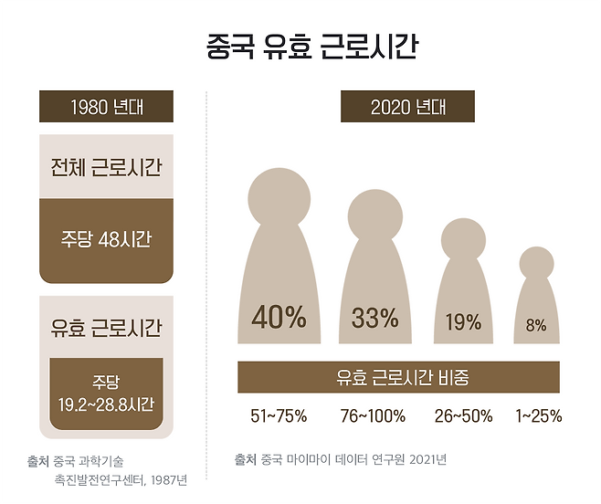 당시 중국은 주 6일 근무를 채택해 법정 주당 근로 시간이 48시간이었는데, 이 가운데 주당 평균 ‘유효 근로 시간’은 19.2~28.8 시간이었습니다.