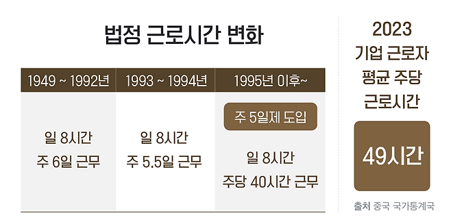 중국 국가통계국에 따르면 2023년 중국 기업 근로자의 평균 주당 근로 시간은 49시간에 달했습니다.