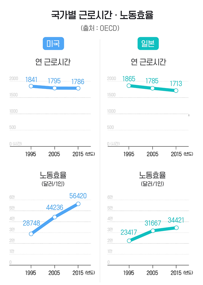 결국 핵심은 효율입니다. 근로 시간과 노동 효율 변화 흐름을 보면, 근로 시간이 줄어들어도 효율은 올라갔습니다.
