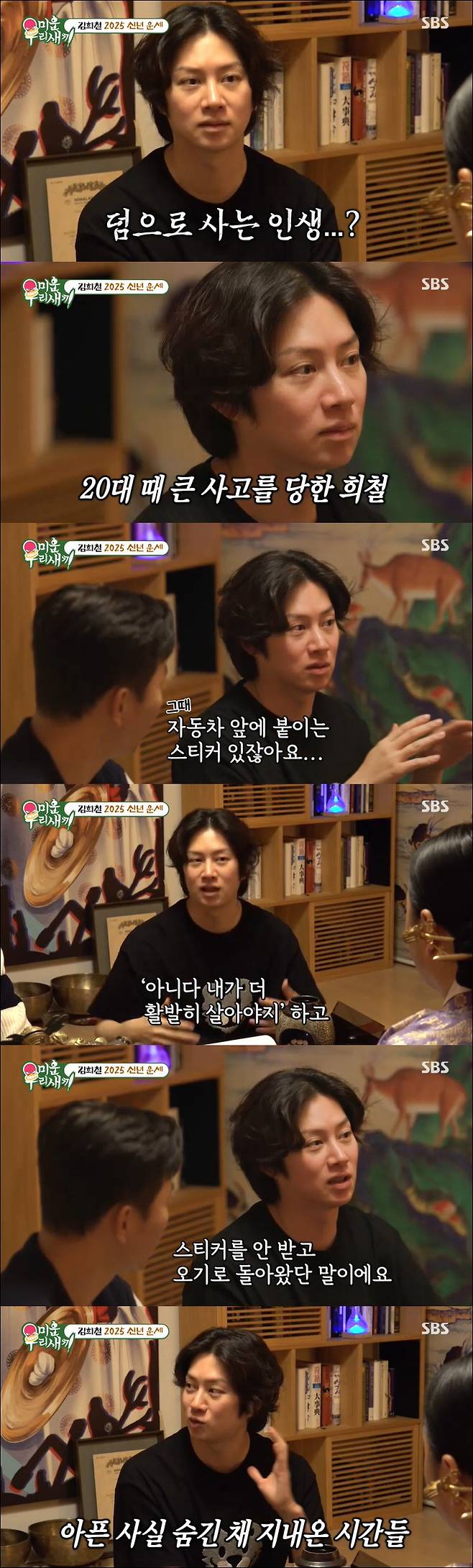무속인은 "올해 2025년 7월 조심해야 한다. 여름에 조심해라. 골절이 되거나 어디가 부러지거나 하면 진짜 장애인도 될 수 있다. 조심해야 한다"고 강하게 경고했다. 이에 김희철은 "제가 원래 장애인 등급이다. 장애인 등급을 받고 원래 자동차 앞에 붙이는 스티커 있지 않냐. 예전에 받으러 가다가 '아니다. 내가 더 활발히 살아야지'하고 스티커를 안 받고 오기로 돌아왔다. 그때는 내 몸이 아프다는 걸 인정하기 싫었다. 그래서 '극복해야지'하고 돌아온 게 10년 전이다. 팬들이 슬퍼할까 봐 원래 이런 얘기를 안 했다"고 고백했다.