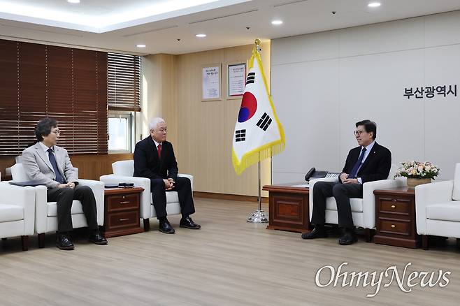 | ▲ 박형준 부산시장이 13일 부산시청 의전실에 문화예술분야 신임 공공기관장(고인범 영화의전당, 오재환 부산문화재단) 대표에게 임명장을 수여한 뒤 의견을 나누고 있다. |