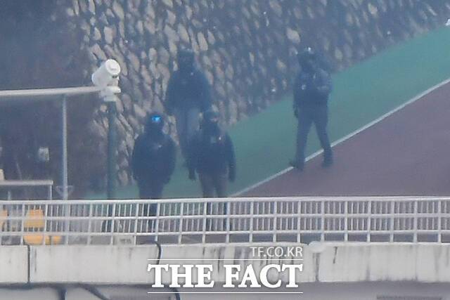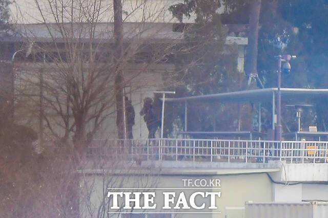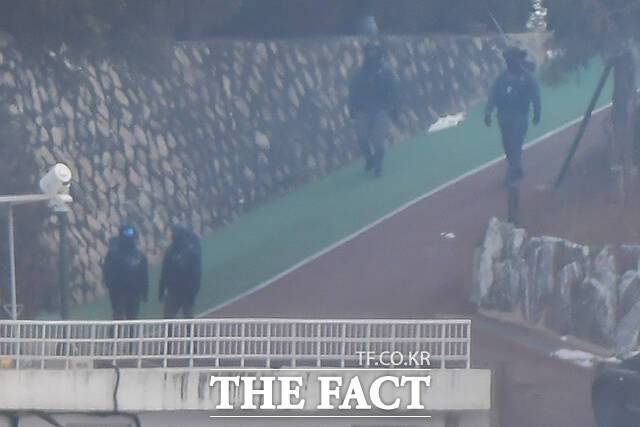 [더팩트ㅣ장윤석 기자] 윤석열 대통령에 대한 2차 체포영장 집행이 임박한 13일 오전 서울 용산구 한남동 대통령 관저에서 전투 헬멧과 전술복 등 장비를 착용한 경호처 관계자들이 경내를 순찰하는 모습이 포착됐다.