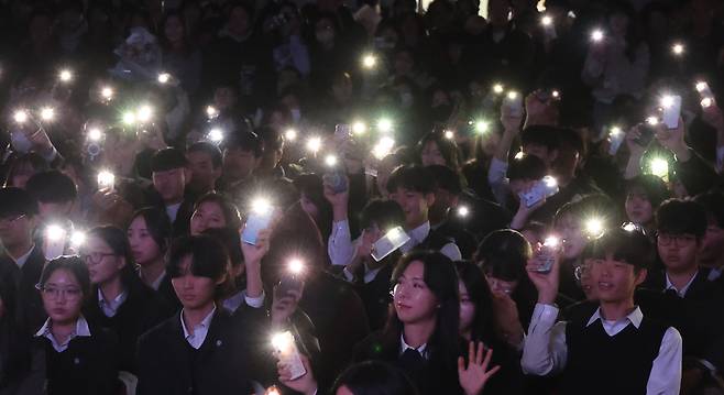 ■ 오후 2:30 [포토타임] 부산 한바다중학교 눈물바다 졸업식 13일 부산 수영구 한바다중학교에서 제53회 졸업식이 열렸다. 졸업생들이 휴대폰 불빛을 비추며 선생님과 친구들의 이별을 아쉬워하는 퍼포먼스를 하고 있다.