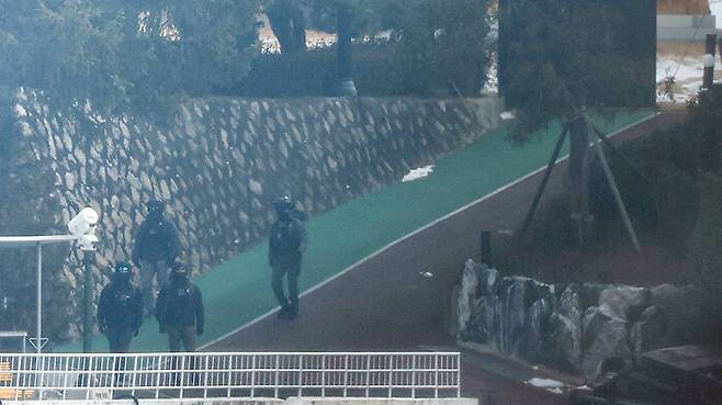 ▲ 고위공직자범죄수사처(공수처)가 윤석열 대통령에 대한 체포영장을 재발부받은 지 일주일을 맞은 13일 오전 서울 용산구 한남동 대통령 관저에서 경호처 대테러과 소속으로 추정되는 직원들이 순찰하고 있다.