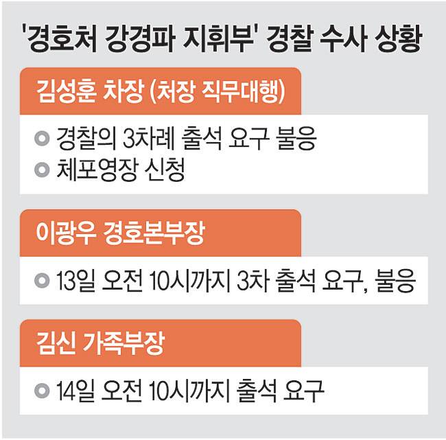 공수처와 경찰은 김 차장, 이광우 경호본부장 등에 대해 체포영장을 신청한 뒤 법원으로부터 영장이 발부되면 15일이나 16일쯤 관저로 진입, 이들에 대한 체포를 명분으로 경호처 대오를 무너뜨리고 윤 대통령 신병 확보에 나설 것으로 전망된다. 한편 이 본부장은 이날 오전까지 경찰의 3차 출석 요구에 응하지 않았다. 경찰은 체포영장 신청을 검토할 전망이다.