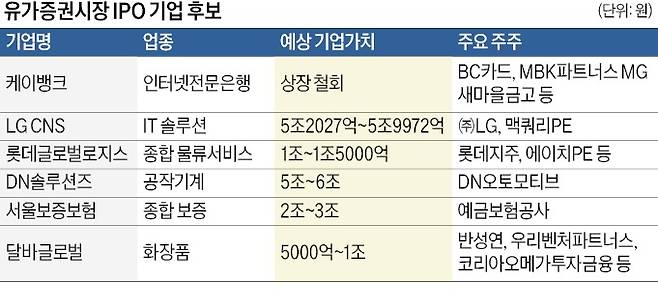 LG CNS, 롯데글로벌로지스, 달바글로벌을 비롯한 'IPO 대어'들은 케이뱅크와 비슷한 고민을 하고 있다.