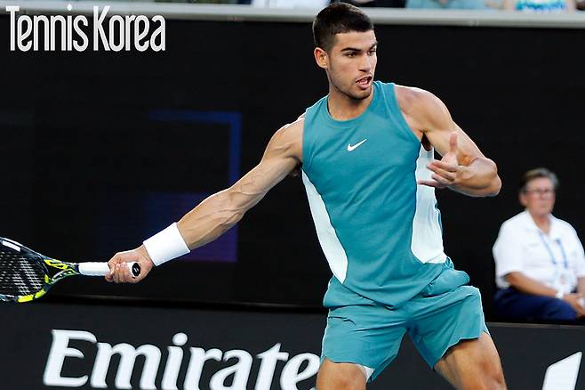 <사진. 강한 포핸드를 구사 중인 알카라스>