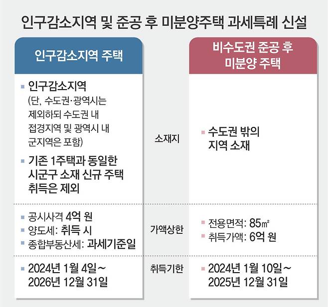 다음으로 추가로 신설된 비수도권 소재 준공 후 미분양 주택의 취득 요건을 살펴보자. 혜택은 같지만 주택의 요건은 조금 다르게 설정되어 있다. 소재 지역은 수도권 밖의 지역이면 해당이 된다. 취득하는 미분양 주택은 전용면적 85㎡ 이하, 취득가액이 6억 원 이하여야 한다. 그리고 취득기간은 2024년 1월 10일부터 2025년 12월 31일까지다. 따라서 요건에 맞는 인구감소지역 주택 또는 비수도권 준공 후 미분양 주택을 추가 취득하더라도 취득 전과 같이 1가구 1주택 특례를 그대로 유지할 수 있다.