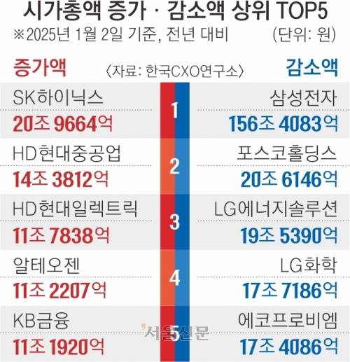 삼성전자 156조 ↓ 하이닉스 21조 ↑… 작년 한해 시가총액 249조 줄었다