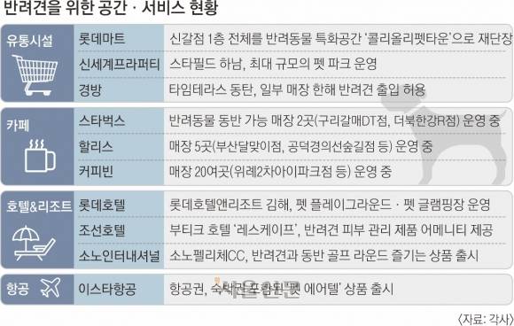 반려동물 동반 입장을 시작한 쇼핑몰은 2016년 9월 문을 연 스타필드 하남이 처음이다. 스타필드는 7곳(스타필드 시티 포함) 전점에 반려견 동반 입장뿐 아니라 전용 휴식·놀이·쇼핑 공간 등을 갖추고 있어 반려인들의 선호도가 높다. 고객 수요가 점차 높아지자 스타필드 하남은 지난해 7월 1190㎡(약 360평) 규모의 펫파크를 열었다. 현재 현대프리미엄아울렛 김포·송도점 등 4곳도 반려동물 출입을 허용하고 있다.